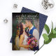 Fotokortsdesignen "Vår första gifta jul" för ett nytt par har ett foto från porträtt från bröllopsdagen med en snyggt vit textövertäckning som kan vara personlig. Kortets baksida har en midnatt/marin blå bakgrund färg (kan ändras) med ett lövbart blommönster.