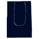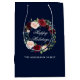 Glad jul. Elegant blå bakgrund med vattenfärg burgunder marsala blomsterkrans julfirande presentpåse. Inkluderar vackra rosor och botanisk grönska.