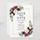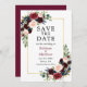Elegant Watercolor Burgundy Blue Blommigt Spara Tillkännningskortet för Förlovning Bröllop omfattar burguny ro, rosa ros, röd ros, blåa blommor och botaniskt grönt på guld.