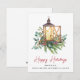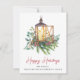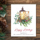 Julhälsningar av elegant för ditt företag med en vattenfärgad illustration av ett ljus för julljus på en arrangemang av säsong gräs, eukalyptus bär och greenery och "Glad helg" skrivet i ett rött skript av contemporaryn. Anpassa hälsning och ditt företag namn i enkel modern typografi.