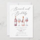 I elegant är inbjudningskort för möhippan en perfekt för vin tematiska möhippor. Det har ett kalligrafiskt skript "Brunch and Bubly", med titeln och vattenfärgen flaskor och glas av rosa och rött vin. Baksidan av inbjudan är en rosa vattenfärgsbakgrund.