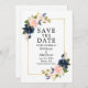 Elegant Watercolor Rosa Ro och Blue Ro Save Date Bröllop annoncement Card omfattar botaniskt grey på guld ram.