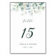 Det här bordsnumret i bröllop har färgade vattenfärgseukalyptus, botanisk grönt och ljusblå löv med modern kalligrafi.