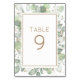 Modern sage grönt och guld vattenfärgsblad gräns i bordsnumret i guld. Samma design finns också på baksidan. Typografin anpassas enkelt, men den kommer också att ändras automatiskt på den andra sidan.