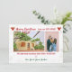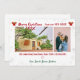 Elegant, sött kort för julhälsningsannonsering med två anpassningsbars flytta och adress och namn för familjemedlemmar samt innevarande år på framsidan för att du ska kunna anpassa dig. Kortet innehåller ett rött band med tre löv och bär, snöflingor, hälsning "God jul från vårt NYA HEMMA!" och ett hjärta. Du kan ersätta hjärtat med text, till exempel "Med kärlek".