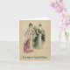 Två eleganter Victorian Dam, klädd i färgstarka gåvor. Hälsning: Grattisar eller Anpassa med din egen personlig hälsning. Bild från Designer Magazine - november 1899 överlappade på en shabby gammal grunge end-papper som skannats från en gammal vintage 1867 era bok. Ljust gult eller beige i färg.