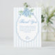En vintageinspirerad, klassisk och elegant stor-millennial-design med en viktoriansk engelsk trädgårdsestetik. Ömtåliga akvarellblå hortensior och charmerande glömmig ej-blommor är arrangerade mot mjuka blå preppy-ränder med en randig handritad oval ram.