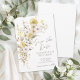 Meddela din kommande bröllop med detta mjuka och romantiska blommiga "spara datumet"-kort, perfekt för en klassisk eller säsongsbetonad firande. Den akvarellmålade buketten – nu med en blandning av gula, vita och beige blommor – sitter i det övre vänstra hörnet för en varm och solig känsla. Ljust salvia-gröna blad lägger till en mjuk jordnära accent som kompletterar de mjukare tonerna. Era namn, bröllopsdatum och plats visas i det nedre högra hörnet i en blandning av handskriven script och klassiska serif-teckensnitt, vilket håller layouten ren och modern. Det övergripande utseendet förblir sött, enkelt och tidlöst, vilket gör det till en underbar passform för höst, vår, sommar eller vinter. H