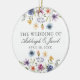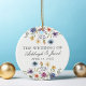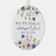 Vackra vildblommor pryder nedre delen av denna färgrika vårbröllops minnessgåva i form av julgrynsprydnad. Akvarell blomsterkanter är perfekta för en trädgårdsceremoni utomhus medan blommorna står i blom. Elegant skrivstil dansar ovanför en vacker orange, lila, gul och blå botanisk äng på denna personliga present eller bröllopsgåva.