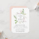 Elegant vildblomma botanisk fyrkantsram, bröllopsinbjudan. Ömtåliga och luftiga gröna botaniska blad och grenar med mjuka lila och rosa vilda blommor. Baksidan av kortet har en solid kronblad rosa färg.