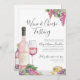 Akvarell Elegant Ost Vinprovning Party Inbjudan. Ett förtjusande rosa och lila vinprovningstema för vin- och ost- eller vinprovningsfest perfekt för en inflyttningsfest, födelsedag, förlovningsfest, tjejkväll eller bara för kärlek till vin! Komplett med akvarell rosa vinflaskor och glas vin, en liten gul ost och förtjusande druvor i rosa och lila och naturligtvis gröna vinblad.