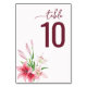 Det här eleganta bordskortet för bröllop har en minimalistisk design med vit bakgrund, vilket ger en luftig och sofistikerad känsla. Siffran "10" visas framträdande i fet, vinröd serifstil, kompletterad med ordet "table" skrivet i matchande kursiv stil ovanför. En delikat akvarellillustration av rosa liljor med gröna blad tillför en touch av naturlig skönhet i det nedre vänstra hörnet och förstärker den övergripande charmen. Den harmoniska blandningen av modern typografi och traditionella botaniska element gör det här kortet perfekt för att tillföra en raffinerad touch till din bröllopsmottagning.