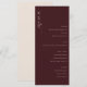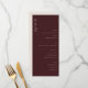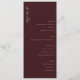 Denna eleganta meny för bröllop har en sofistikerad vinröd bakgrund med knivskarp vit text, vilket skapar en slående kontrast som förbättrar läsbarheten. Layouten är vertikal och centrerad, med ett balanserat och symmetriskt utseende, medan den kursiva titeln "meny" tillför ett konstnärligt touch. Rena sans-serif-teckensnitt används för tydlighetens skull, med feta rubriker för enkel navigering genom sektioner som Förrätter, Sallad, Huvudrätt och Efterrätt. Den minimalistiska designen betonar enkelhet och förfining, vilket gör den perfekt för formella måltidsupplevelser.