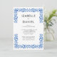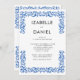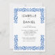 Denna trendiga bröllopsinbjudan har en blå vintage ornament ram med blå blommor. Njut av det!