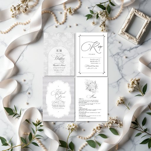 Den här menyn elegant vintage bröllop innehåller en detaljerad svartvit illustration av blommigten och klassisk kalligrafi-stil-typografi. Perfekt för tidlös bröllop, den här menyn lägger till sofistikering och charm till din speciella dag. Fullständigt anpassade med menyinformationen.