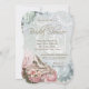 Vacker champagne rosé, tealblå och rosa ros och högklackad sko med pärlor elfenbensvitt bröllopsdusch-inbjudan. Denna eleganta vintage bröllopsdusch-inbjudan kan enkelt anpassas för ditt evenemang med ditt val av formulering, typsnitt osv.
