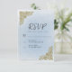 Detta eleganta svarsbrevskort har en mjuk, dammig blå akvarellbakgrund med utsmyckade förgyllda detaljer i hörnen, vilket ger en raffinerad och romantisk design. Det moderna typsnittet ”RSVP” i kombination med klassisk serif-text ger en ren och lättläst layout. Gästerna kan ange sin närvaro med de traditionella alternativen "Accepterar med nöje" eller "Tackar nej med beklagande". Svarsbrevskortet är perfekt koordinerat med vår Soft Dusty Blue bröllopsinbjudan och ger en graciös avslutning på er bröllopspappersvaror.