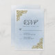 Detta eleganta RSVP-kort har en mjuk, dammig blå akvarellbakgrund med utsmyckade gyllene detaljer i hörnen, vilket skapar en raffinerad och romantisk design. Det moderna “RSVP”-huvudet i typsnittet script är ihopparat med klassisk serif-text för ett rent och lättläst utseende. Gäster kan ange sin närvaro med de traditionella alternativen "Accepterar med nöje" eller "Tackar nej med beklagande". Perfekt koordinerad med vår Soft Dusty Blue svinvitationsserie, ger detta kort en graciös slutlig touch till din bröllopsbrevpappersutval.
