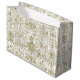 Elegant gift bag with a touch of luxury featuring baroque ornamental flourish and graceful swirls in golden beige on ivory white with a central winged cupid angel playing a flute, a meaningful Latin motto on flying ribbon "Virtus sine superbia.." meaning "Virtue without pride, pleasure without lust, will kindle with eternal flames." Prefect for sophisticated taste for any festive occasion: Christmas, birthday, Valentine's day, Bridal shower, wedding, anniversary..