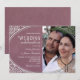 Elegant, vintage, lyx lila bröllopsinbjudan med foto, silver blomsterbroderad ram och modern kalligrafi stil.
