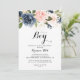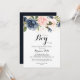 Denna eleganta vinterblomma det är en pojke baby shower inbjudan är perfekt för en modern baby shower eller sprinkle. Designen har vackra handmålade mörkblå, blå, marinblå, rosa, rosafärgade, guld blommor och grön lövverk, samlade i eleganta buketter.