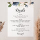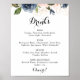 Denna eleganta vinterblomma meny skylt för bröllopsdrycker är perfekt för ett modernt bröllop. Designen har vackra handmålade mörkblå, blå, marinblå, rosa, rosaton, guldfärgade blommor och grön lövverk, samlade i eleganta buketter.