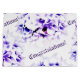 Elegant Violets-design har bakgrunden mönster i en vacker bukett med violetta blommor i fullt-blomman. Anpassadet ord "Grattisar!" visas i ett Gammalt engelskt teckensnitt. Designad att samordna med "Elegant Violets Catholique Bröllop Suite".