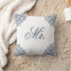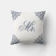 Denna eleganta vita och blå kudde med ett skrivet ord Herr är en del av matchande produkter för att göra en uppsättning av två kuddar som en gåva till nygifta.