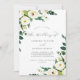Den här elegantens vita blommigt-schemat för evenemangsinbjudan är perfekt för ett klassiskt destinationsbröllop. Den moderna vintagen har en vackert romantisk elfenben- och krämvattenfärg ro och blommor med mörk grönt löv, grönt och botaniskt material. Inkludera inbjudan till bröllop på framsidan och en tidslinje bröllop helg på baksidan.