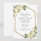 Elegant och formell inbjudan till bröllopsrepetition middag med chic känsla har romantiska bröllopsrosor i akvarell vit nyans med inslag av rosafärgat skär i lummigt grönt på en krispig vit bakgrund. En glänsande gyllene geometrisk kristallformad ram ger en trendig touch. Personifiera bröllopsevenemangets detaljer för dina gäster med elegant kolgrå bokstavsstil och typsnitt. Baksidan av kortet är en enkel matchande vit. Kontakta mig gärna på invitationsuites@gmail.com om du har frågor om denna eller någon av våra designer.