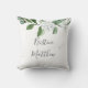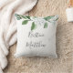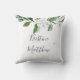 Denna eleganta anpassade blomsterkastkudde för nygifta har en handmålad grönsakskrans med vita magnoliablommor. Personifiera med brud och brudgum namn för en unik present. Designad av Susan Coffey.