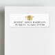 Elegant vit etikett för examensadress med en guld gradueringsmössa och examenets namn och adress i modern typsnitt.