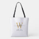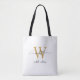 Flickaktig Enkel Elegant Modern Vit och Guld Monogram Initial Namn Signatur Script Anpassad Personlig Toteväska. Denna design med ditt förnamn i en snygg handstilsfont med svans (eller kalligrafi) med monograminitial och efternamn eller fullständigt namn i guld och svart på vit bakgrund. Underbart feminint gåvoproblem till födelsedag, jul, bröllop, brudshow, 16-årsfest, möhippa eller examen och det är för tjejen som gillar minimalistiska och rena saker.