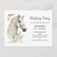 Födelsedagsinbjudan med en magisk illustration av ett vackert vitt hästhuvud. Omgiven av söta små rosa blommor. Boho elegant känsla för hästälskare.