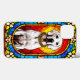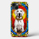 Livfull framställning av en vit hund prydd med en guldkedja avbildad i slående glaskonst som visar upp livfulla färger och intrikata designelement.