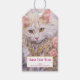 Ge märkre med en vacker illustration. En vit katt med långa halsar tittar regal och elegant. Omgivna av rosa blommor, guld och diamantsmycken.