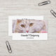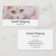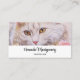 Affärskort med en vacker illustration. En vit katt med långa halsar tittar regal och elegant. Omgivna av rosa blommor, guld och diamantsmycken.