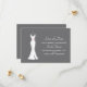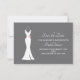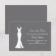 En save the date platt kortset på en klassig grå bakgrund. Designad med en elegant vit klänning som hänger från en galge. Enkel minimalistisk design.