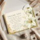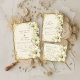 En elegant och tidlös design med mjuka vita liljor och gyllene ornamentala detaljer på en pergamentbakgrund. Detta romantiska blomsterkonstverk fångar en förfinad, vintage charm - perfekt för klassiska, formella eller trädgårdsbröllop. Personifiera med era namn och evenemangsinformation för en graciös och lyxig touch.