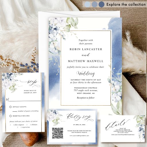 Önska dina gäster med det här vackra allt i en bröllopsinbjudan med rikliga vattenfärgblommor och grönska inhägnade guldram som visar dina bröllop-detaljer. Du behöver inte sätta in kort, eftersom den här designen ger dig möjlighet att lägga till information som du vill på baksidan! Modern skrift calligraphy inslag . Förmåga att byta "tillsammans med sina föräldrar" till "tillsammans med sina familjer", "tillsammans med underbar glädje" eller "tillsammans med underbart nöje". Blommigt och grönhet i en vacker blandning av vitt, grått, marin, dammblått, periwinkle och grönt nyanser. Tillbaka med samma blommigt och grönare detaljer från framsidan, monogram med par initialer och textområde för din bröllop webbplats, osa eller eventuella mottagningsdetaljer som du föredrar. En del av vår "Elegant Bliss"-samling med en mängd olika koordinerande inbjudningar, utskick av tillbehör, spara datumen, tack vare kort och händelsemärken och produkter. Besök hela samlingen på: https://www.zazzle.com/collections/elegant_bliss_collection-119067295475874152