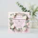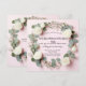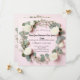 Denna tidlösa bröllopsinbjudan design har en delikat blomsterkant av vita rosor, babysand och eukalyptusblad på en mjuk pastellrosa bakgrund. Perfekt för par som söker ett klassiskt och romantiskt bröllopstema