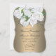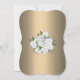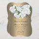 Just den här bleken Bronze och den vita bröllopsinbjudan till blommigt har en vacker bukett av vit ros över en underbar metallisk, ljusbrun/broniserad metallbakgrund. Kortets baksida har en stor vit ros-bukett i mitten.