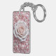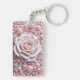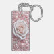 En lyxig komposition med en vit ros omgiven av rosa pärlor och glänsande accenter, som representerar skönhet och sofistikering.