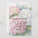 This elegant wedding design features beautiful watercolor hydrangea blooms in soft shades of pink, blush, and delicate white, with a hint of blue, surrounded by lush green leaves. The romantic floral arrangement creates a timeless and sophisticated look that is perfect for wedding invitations, bridal shower stationery, rehearsal dinner invites, or other wedding celebration décor. The soft watercolor style adds a graceful garden-inspired charm, making it ideal for spring and summer weddings or any couple who loves classic floral elegance.
