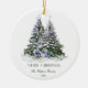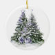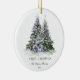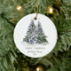 Den keramiska prydnadsprodukten i elegant har en vacker lila och grönt vattenfärg i Julgranar, försedd med glasdekorationer och omgiven av inslagna presenter. Ordnamnet innehåller också GOD JUL-meddelandet i ett elegant-teckensnitt. Anpassa prydnaden genom att lägga till din familj namn och året.