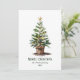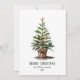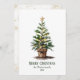 Den här eleganten är julkortet ett vackert skrivet vattenfärgstryck som illustrerar ett krukt Julgran med snö täckt grenar, varmt ljus och en gyllene stjärna. Kortet innehåller helgdag önskemål, varm, fred och glädje för säsongen. Den mysiga, rustiska träd-designen och den milda färg-paletten gör det till en perfekt att skicka kärlek till vänner och familj. Perfekt för dem som uppskattar unika, festliga och personlig helgdagskort.