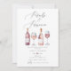 I elegant är inbjudningskort för möhippan en perfekt för vin tematiska möhippor. Den har ett kalligrafiskt skript med titeln "Petals and Prosecco" och vattenfärgen flaskor och glasögon av rosa och rött vin. Baksidan av inbjudan är en rosa vattenfärgsbakgrund.