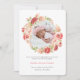 Mall för rosa av elegant blommigt för födelseanmälan med med blommigt illustrationer av korall rosa ros, lavender, granatfrukter och grönt bladverk på framsidan. Baksidan visar en koral rosa-polka-punktbakgrund. På framsidan, en bild till din nyfödda som kan läggas till på detta kort. Använda en fyrkantig storlek bild så att den passar lätt. De pappra egenskaperna runt kant. Perfekt kort för att meddela att nyfödd bebis kommer med sin födelsestatus. Underbar för både pojke och flicka. Perfekt för sommar- och vår-säsonger!