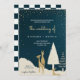 Elegant wedding invitation with gold deer and trees on a dark teal background, featuring text for Richard and Sophia's event. The back is solid teal.