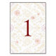Elegant floral table number design featuring delicate blooms and intricate foliage arranged in a charming, sophisticated style. The design showcases a beautiful blend of soft pastel colors and subtle accents, creating a romantic and timeless look. Perfect for weddings, this design combines floral artistry with clear, bold numbering to add a touch of grace and charm to each table setting.